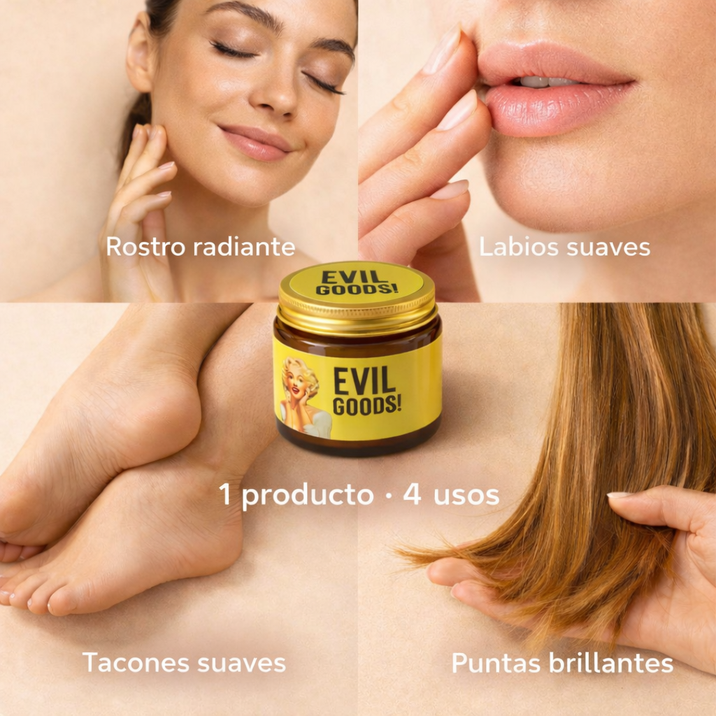 Crema corporal + bálsamo labial + tratamiento capilar + crema de talones + sérum facial — todo en 100ml.